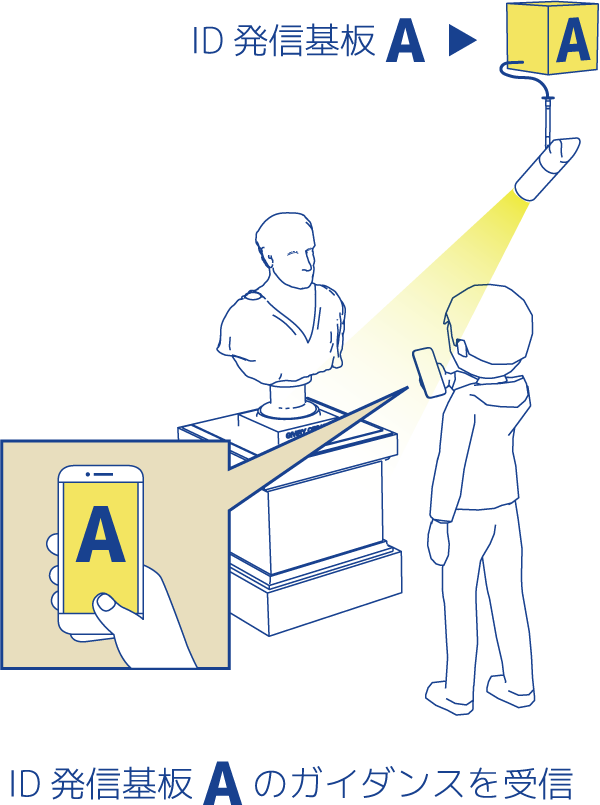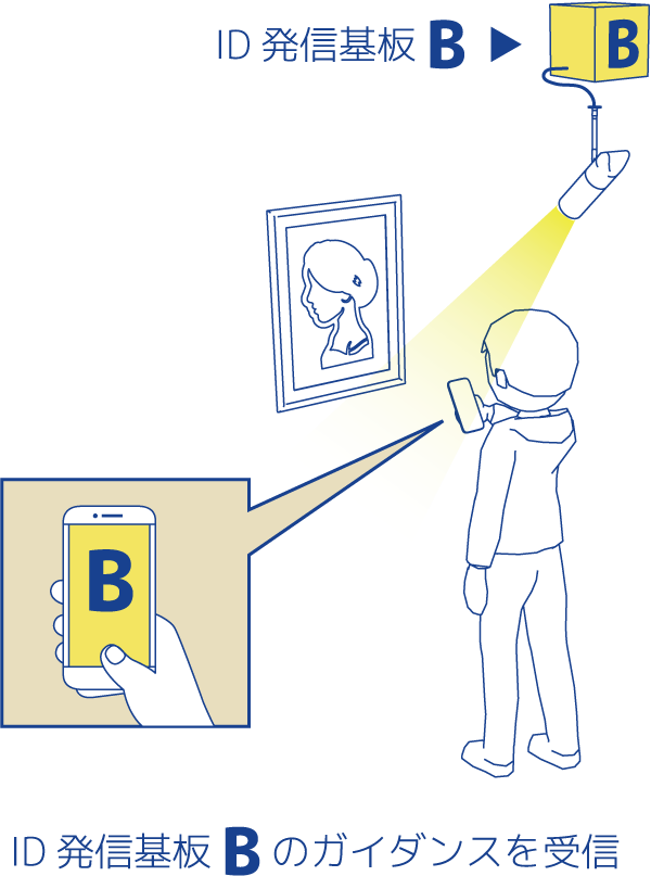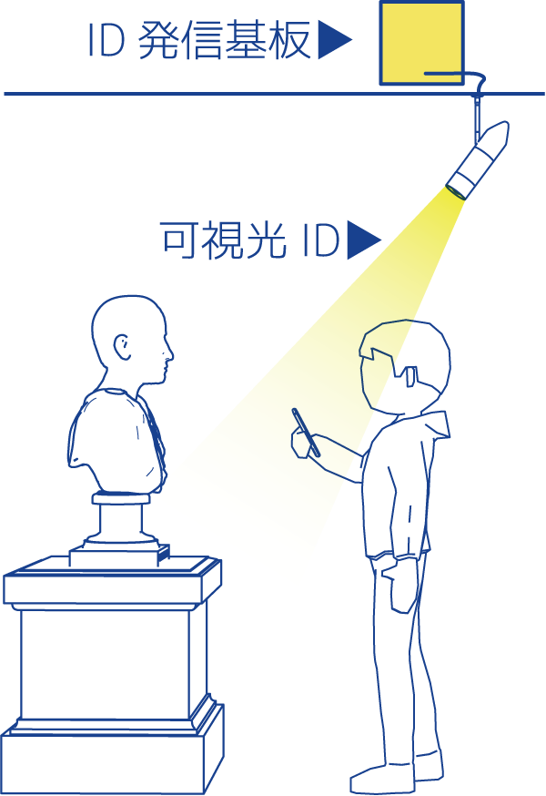 LpisのID発信基板を組み込んだ照明の光に、アプリを起動したスマートフォンやタブレットのカメラをかざすと、すぐに情報が表示されます。例えば美術館の展示空間の中で絵画作品や説明パネルが隣接していてもユーザーの移動に合わせて、スムーズに次の情報に変わります。「反応が遅い」「うまく表示できない」ということもありません。受信と情報表示の速さを実感ください。